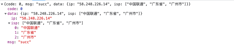 即,通过后台 IP 分析的方式得到了用户的出口 IP 信息并解析出出口 IP 的城市和运营商: