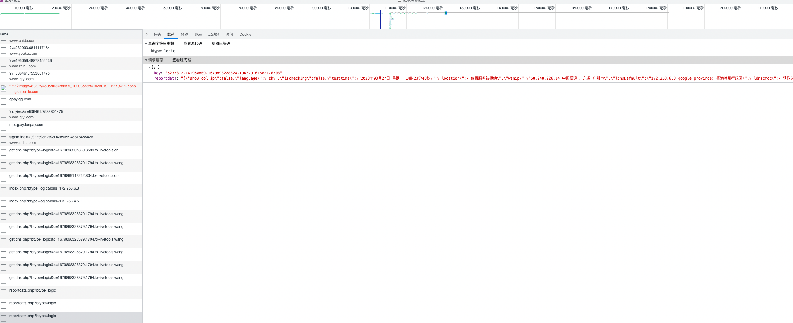 最后,就是上报请求了。可以看到有个 POST 请求,将所有肉眼可见的那些数据,以 json 形式上报给了后台:https://ping.huatuo.qq.com/reportdata.php?btype=logic。