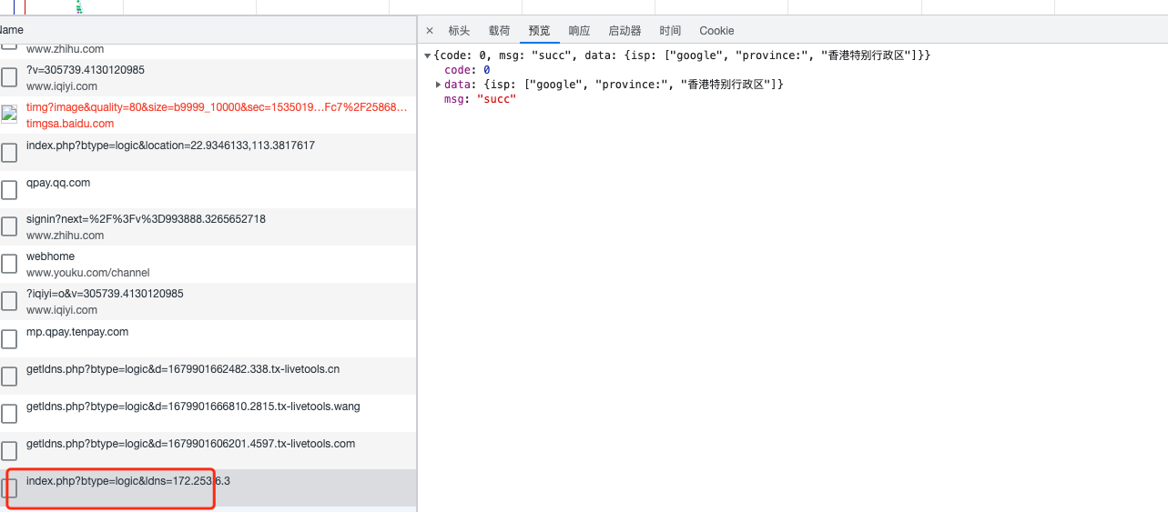 当拿到 DNS IP 后,还需要展示 DNS IP 的地理城市信息,这个时候可以看到他请求了 PHP 后台,通过后台解析传过去的 IP 从而得到地理信息。请求地址为 https://ping.huatuo.qq.com/index.php?btype=logic&ldns=172.253.6.3。