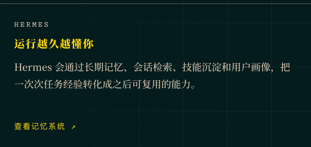- 自我进化:口号是”the agent that grows with you”(与你一同成长的Agent)
